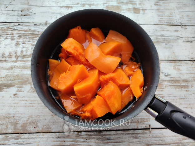 Тыкву можно взять свежую, но для такого варианта очень удобно использовать замороженную. Во втором случае овощ уже мягкий и времени на варку до полной готовности требуется гораздо меньше. Овощ почистить, нарезать на кубики, залить водой, поставить отвариваться до полной готовности.