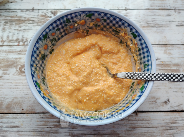 Отвар слить, овощ пюрировать погружным блендером или перекрутить в мясорубке. С творогом тоже следует поступить так же (пробить блендером), если он зерновой, или можно сразу приобрести пастообразный, мягкий продукт.