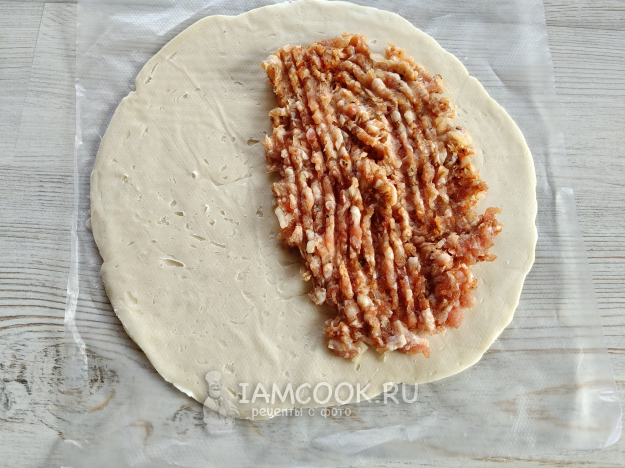 На одну сторону лепешки выложить несколько ложек фарша, разровнять.