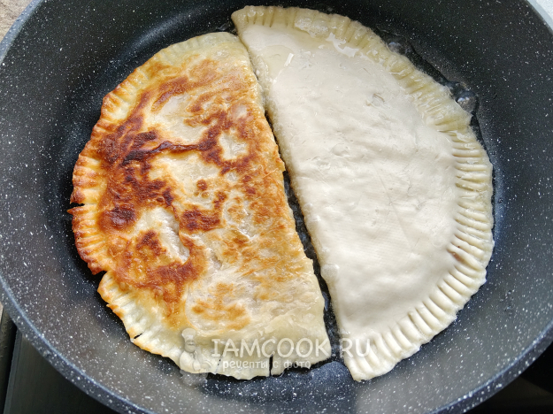 Жарить чебуреки в небольшом количестве масла, но я думаю, что можно и на сухой сковороде.