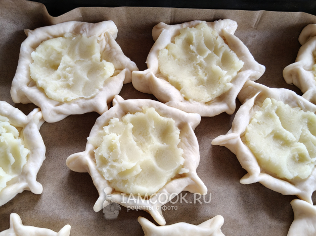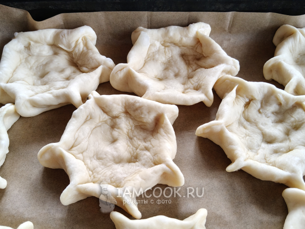 Размять или раскатать в круглую лепешку, защипнуть 6 раз на расстоянии друг от друга.
