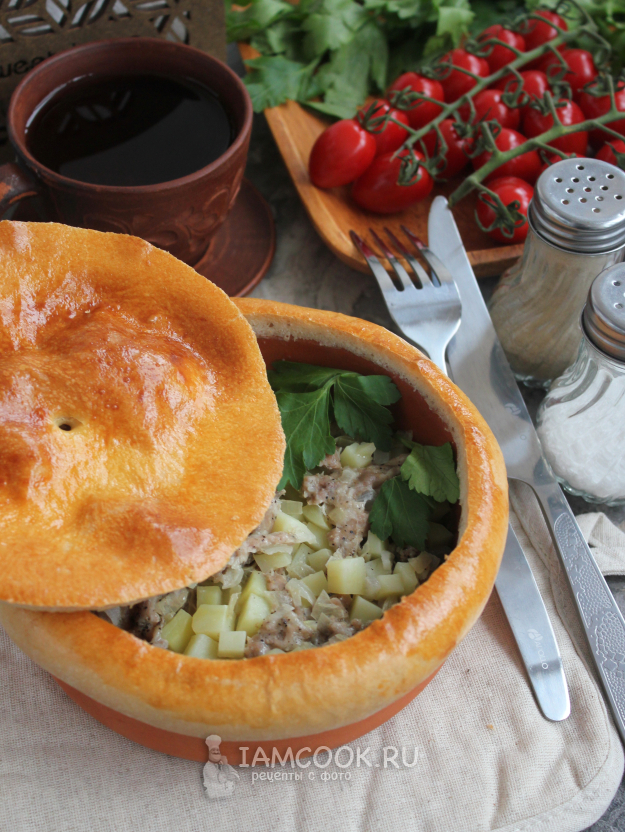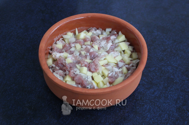 В смазанные керамические формы положите начинку из мяса с луком и нарезанного мелким кубиком сырого картофеля.