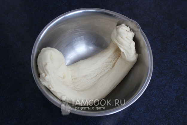 После первого подъёма, примерно через полчаса, тесто обомните и порастягивайте в разные стороны.