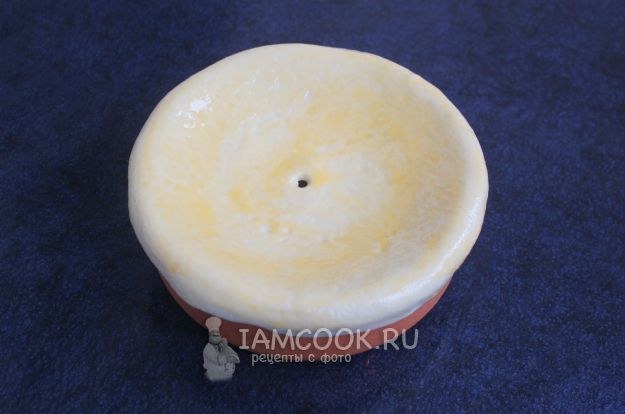 Снова соберите в комок и дайте ещё раз подняться, потом разделите на две части. Каждую нужно будет раскатать в круглые заготовки такого диаметра, чтобы укрыть и зафиксировать их на формах.