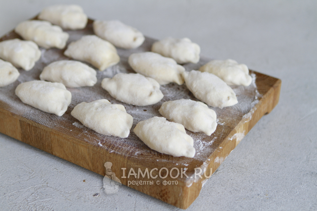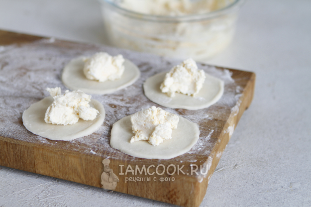 Тесто раскатайте в тонкий пласт. При помощи стакана или вырубки для вареников сделайте заготовки. В центр выложите начинку и закрепите края теста.