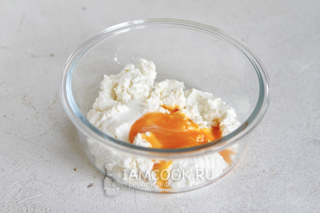 Подготовьте творог. Перетрите его через сито, добавьте немного сахара по вкусу, сметану и желток одного яйца.