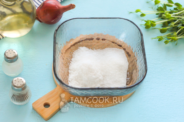 Всыпьте в емкость соль и сахарный песок (по желанию). Можно заквашивать без сахара, а можно вмешать немножко меда. Залейте специи холодной отфильтрованной водой или охлажденной кипяченой и тщательно перемешайте, чтобы они растворились.
