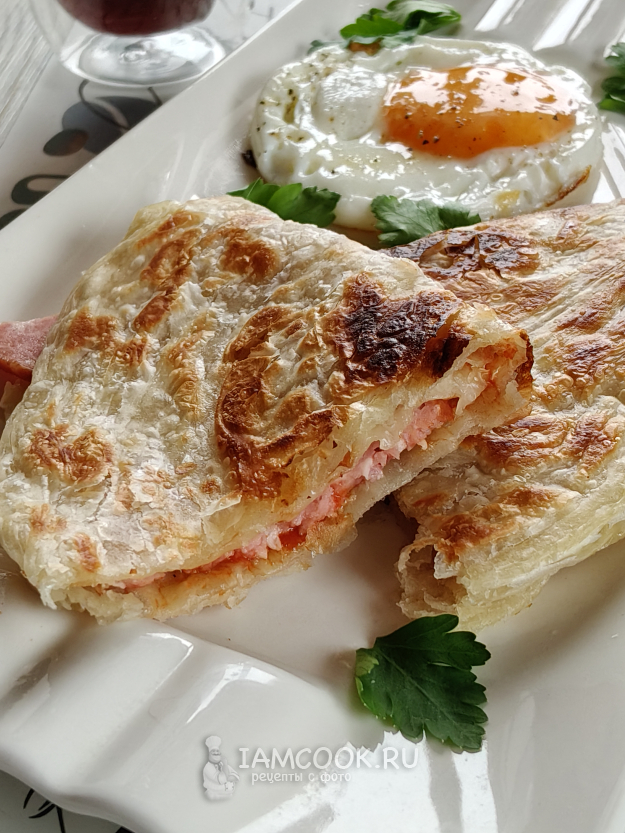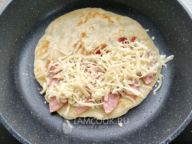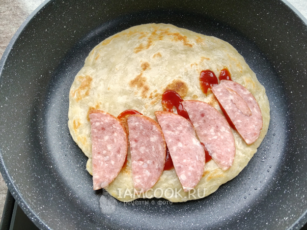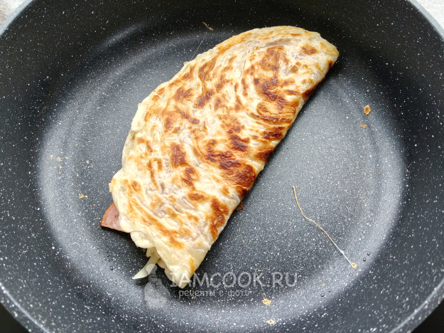Лепешка роти с колбасой и сыром готова, угощайтесь.