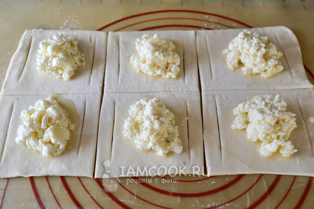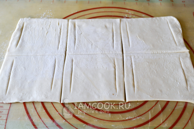 Посыпьте мукой стол. Раскатайте тесто в прямоугольный пласт толщиной около 3-4 мм. Разрежьте на квадраты. На каждом квадрате сделайте два параллельных прореза на противоположных сторонах.