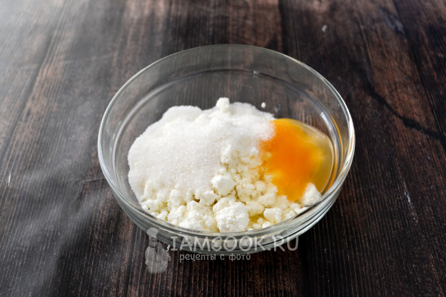 В миску положите творог, разбейте яйцо, добавьте сахар.