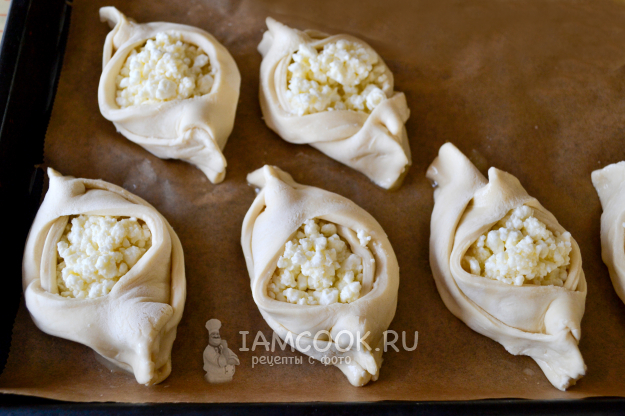 Сформуйте лодочки, поочередно накрыв начинку сторонами с прорезями. Края защипните. Переложите заготовки на противень, застеленный пекарской бумагой. Прикройте чистым полотенцем и оставьте на 20-30 минут для подъема, если тесто дрожжевое. Если тесто слоеное бездрожжевое, ставьте противень в разогретую духовку для выпечки.