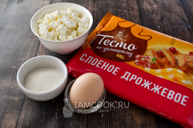 Соберите продукты для приготовления лодочек из слоеного теста с творогом. Тесто заранее достаньте из морозильной камеры и оставьте при комнатной температуре, чтобы оттаяло. Творог лучше взять сухой. Если творог очень влажный, заранее положите его в сито, чтобы стекла сыворотка.
