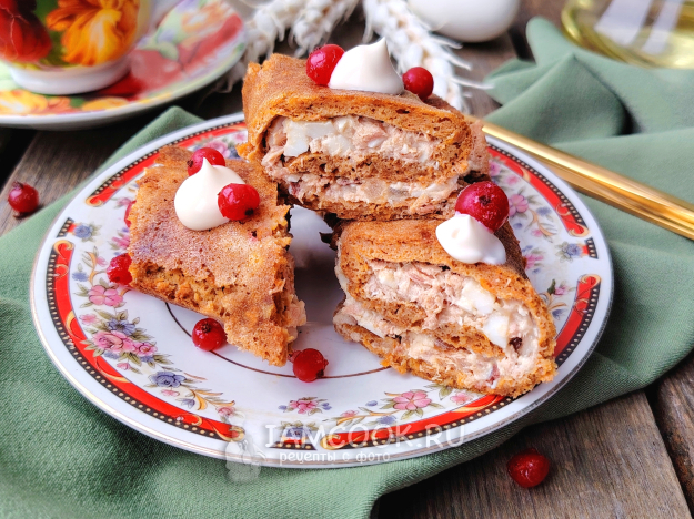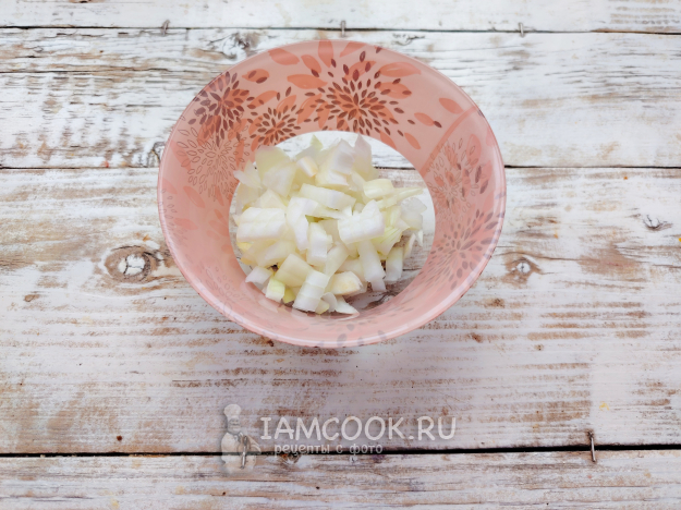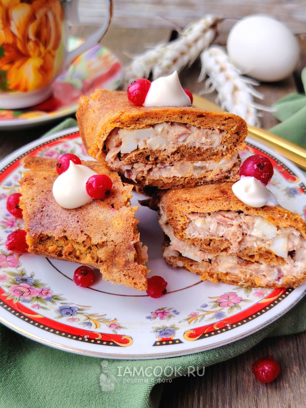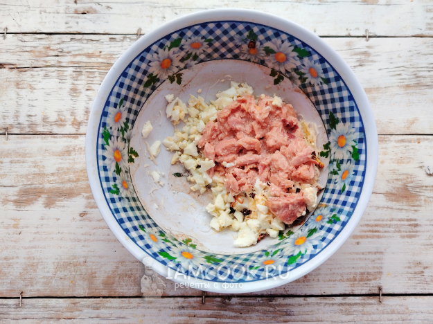Соединить составляющие начинки в глубокой посуде. Если тунец кусочками, то их следует размять вилкой в более однородную массу, жидкость от рыбы в начинке не нужна.