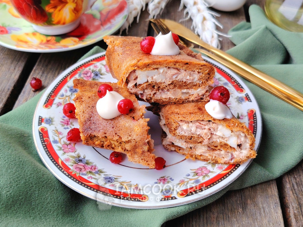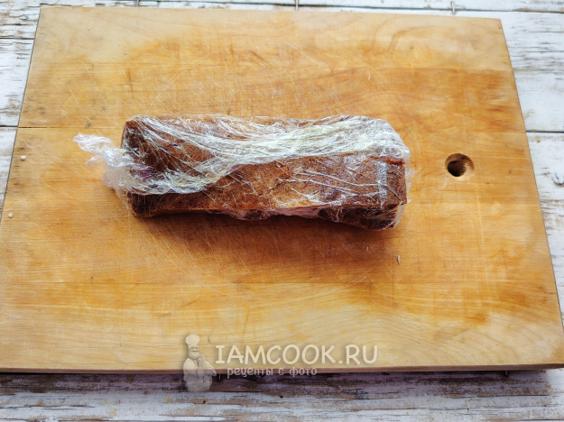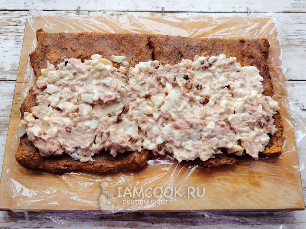 Свернуть в рулет, завернуть в пищевую пленку и убрать на несколько часов в холодильник, чтобы он хорошо пропитался.