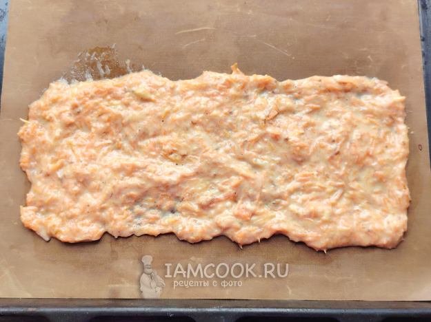 Выложить морковное тесто на коврик для выпечки в форме прямоугольника, отправить в духовой шкаф, разогретый до 180 градусов, на 25 минут.