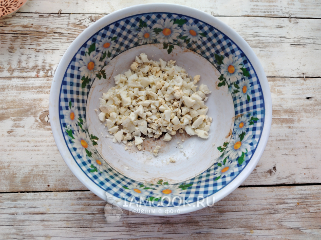 Яйца отварить вкрутую, немного остудить, почистить и мелко порубить ножом.