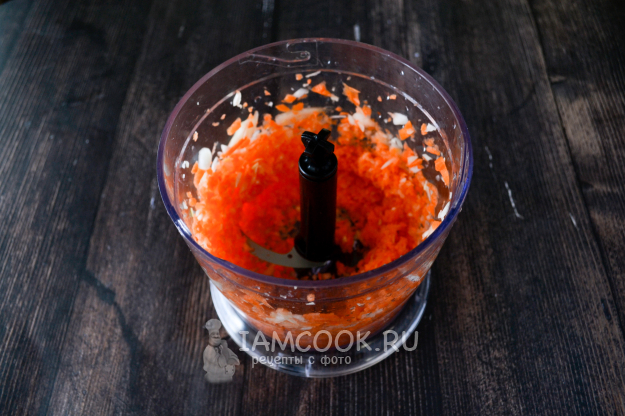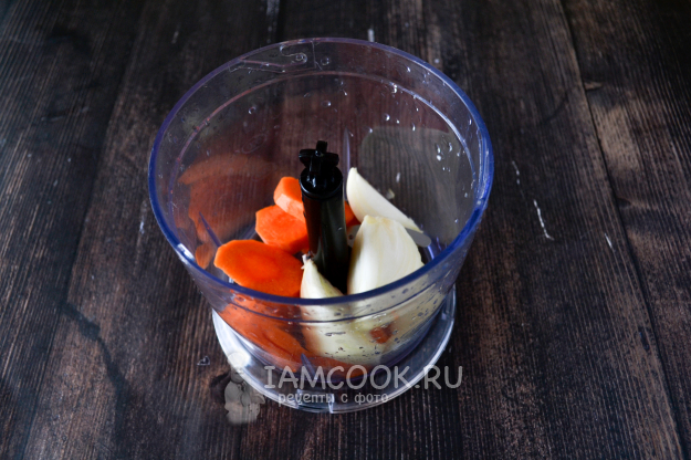 Морковь нарежьте небольшими кружочками, луковицу - на 4 части, сложите овощи в чашу измельчителя.