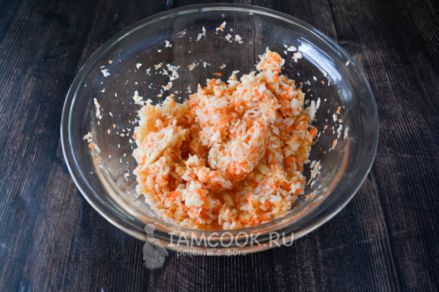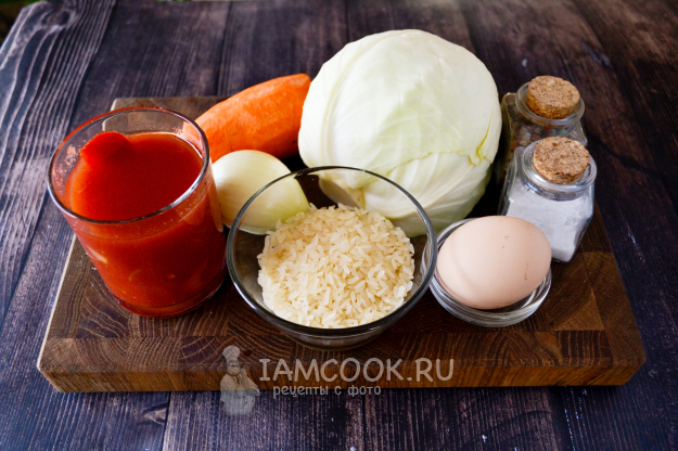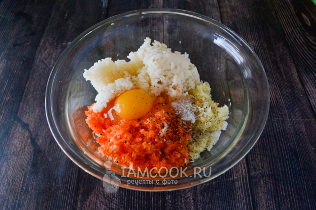 В миску положите измельченную капусту, морковь, лук, отварной рис, разбейте яйцо, соль, черный молотый перец. По желанию положите специи и приправы по вкусу.