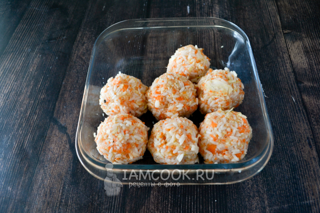 Сформуйте из овощного фарша тефтели. Фарш будет сочный, поэтому при формовке тефтелей слегка отжимайте лишнюю влагу руками. Положите колобки в форму, подходящую для запекания. На дно формы можно капнуть немного растительного масла.