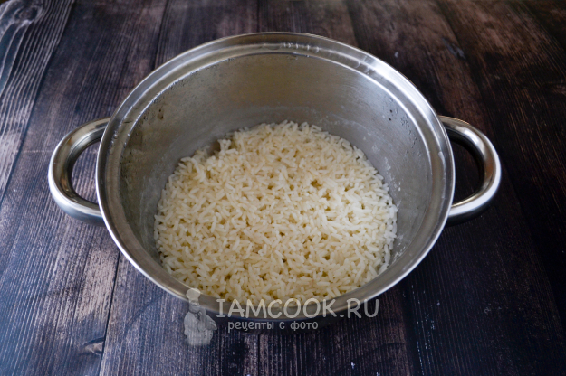 Рис промойте до прозрачной воды, положите в кастрюлю, влейте холодную воду, добавьте соль и поставьте на огонь. После закипания сделайте огонь минимальным и варите 15-17 минут, до полного впитывания воды. Снимите кастрюлю с огня.