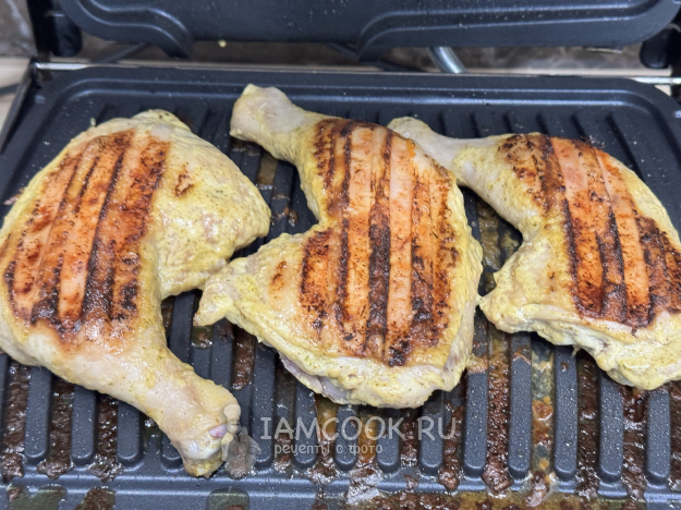 Закрыть створки электрогриля и готовить куриные окорочка 30 минут. Готовность можно проверить, проколов ножом мякоть курицы. Должен выделяться сок, а не кровь.