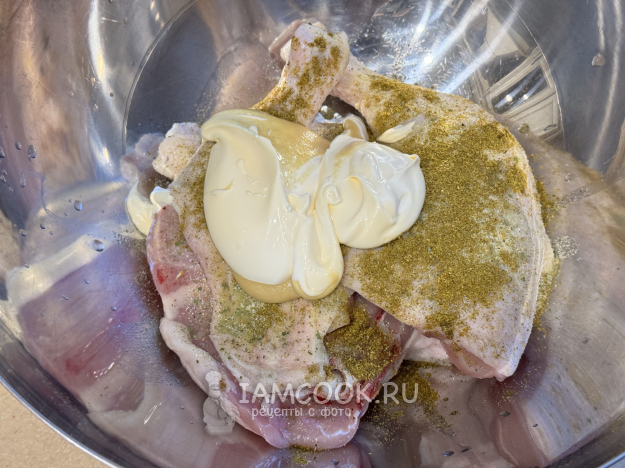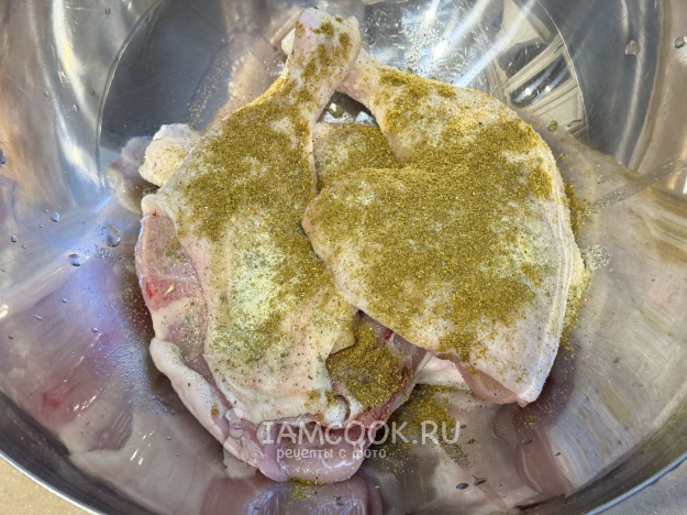 Выложить окорочка в глубокую миску и добавить соль и хмели-сунели.