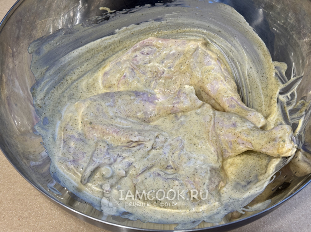 Тщательно перемешать куриные окорочка с маринадом и оставить минимум на 1 час, можно дольше.