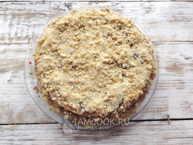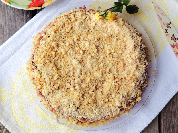 Присыпать сверху и с боков торт крошкой. Убрать заготовку торта на ночь в холодильник, чтобы тесто хорошо пропиталось вареньем.