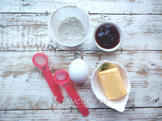 Собрать по списку продукты для песочного торта с клубничным вареньем. Масло необходимо вынуть из холодильника заранее, чтобы оно стало мягким.