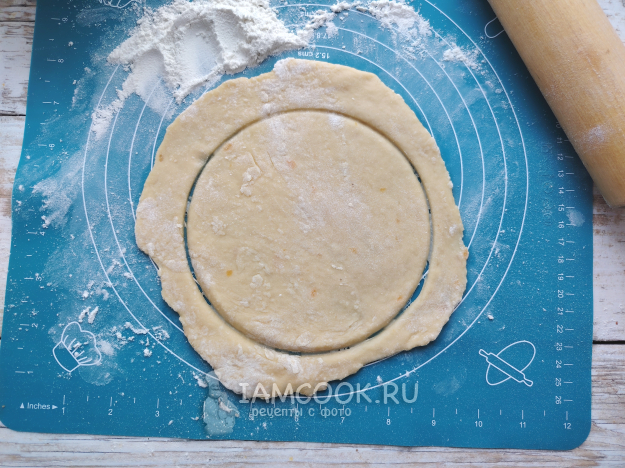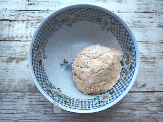 Замешать тесто. Чтобы тесто не стало твердым, долго вымешивать массу не нужно. Достаточно его собрать в шар, завернуть в пищевую пленку и убрать на полчаса в холодильник.
