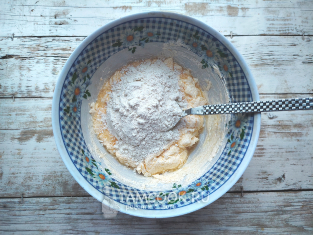 Размешать массу. Всыпать просеянную муку.