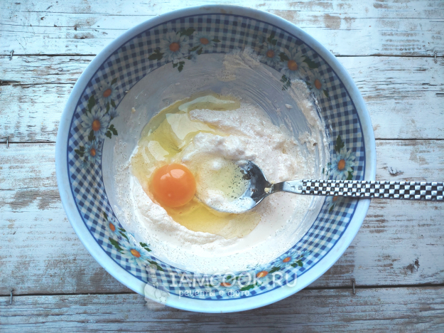 Соду погасить уксусом, добавить в миску. Вместо этой смеси можно использовать готовый разрыхлитель (половину чайной ложки).