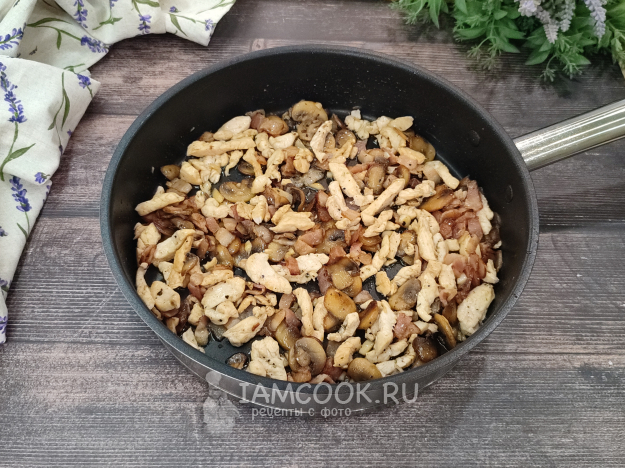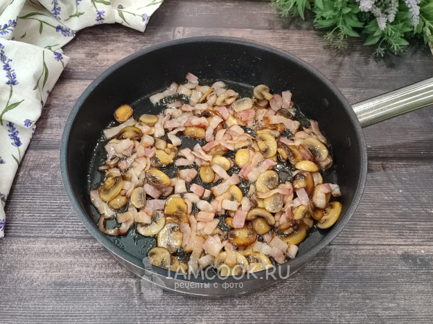 Выложите к грибам бекон, обжарьте, помешивая, до подрумянивания бекона.