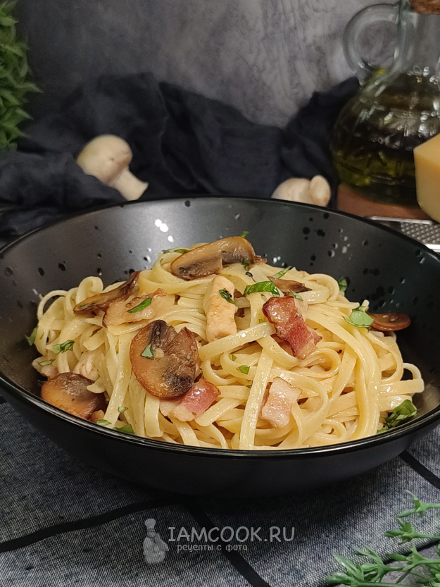 Паста с грибами, беконом и курицей получилась невероятно сочной, ароматной, очень вкусной! При подаче можно немного свежего базилика или петрушки добавить, блюдо станет только вкуснее).
