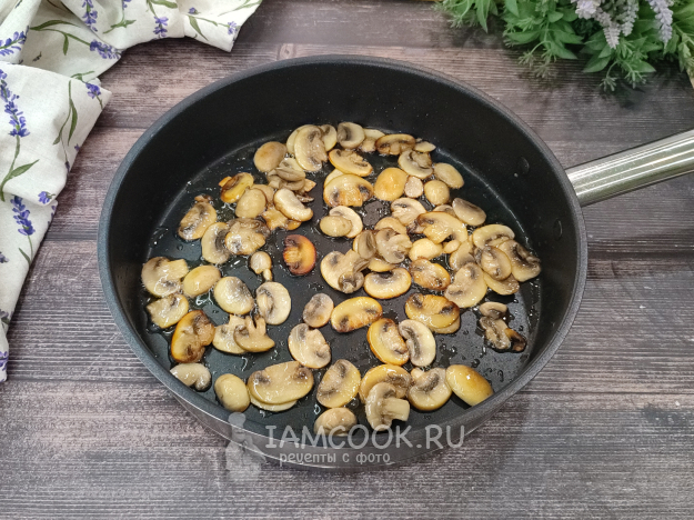 В сковороде разогрейте оливковое и сливочное масла, обжарьте шампиньоны, они свежие, нарезаны тонко, обжарятся довольно быстро.