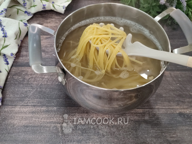 Пасту отварите согласно инструкции на упаковке, зачерпните чашкой примерно 100-150 мл воды, в которой варилась паста, затем откиньте пасту на сито, промывать не надо.