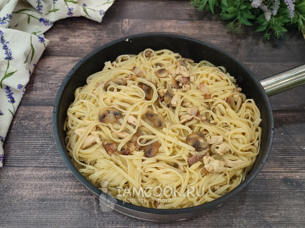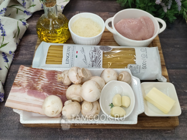 Соберите ингредиенты для приготовления пасты с грибами, курицей и беконом. Пасту можно взять и короткую, я же просто фанат длинной)).