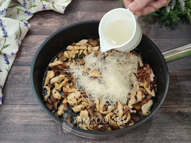 В сковороду добавьте тертый сыр и воду от пасты, чтобы сыр лучше и равномернее расплавился.