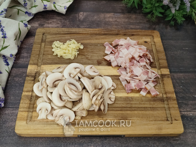 Поставьте воду для пасты на огонь, посолите, и пусть закипает. Займемся соусом. Чеснок измельчите, бекон нарежьте полосками, грибы - тонкими ломтиками.