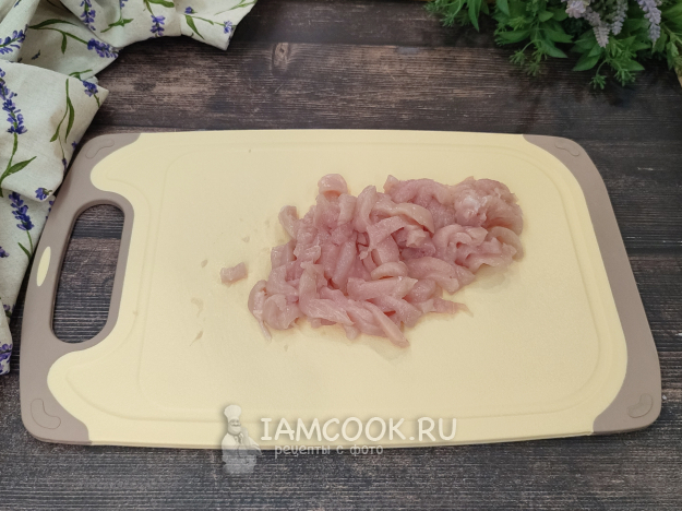 В последнюю очередь добавьте кусочки курицы и чеснок, обжарьте до изменения цвета мяса.