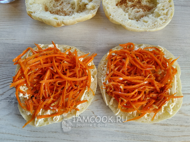 Нижнюю часть смазать майонезом, разложить морковь.