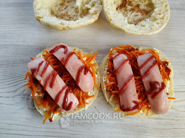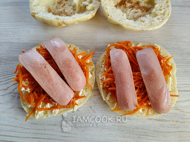 Сверху положить сосиски.
