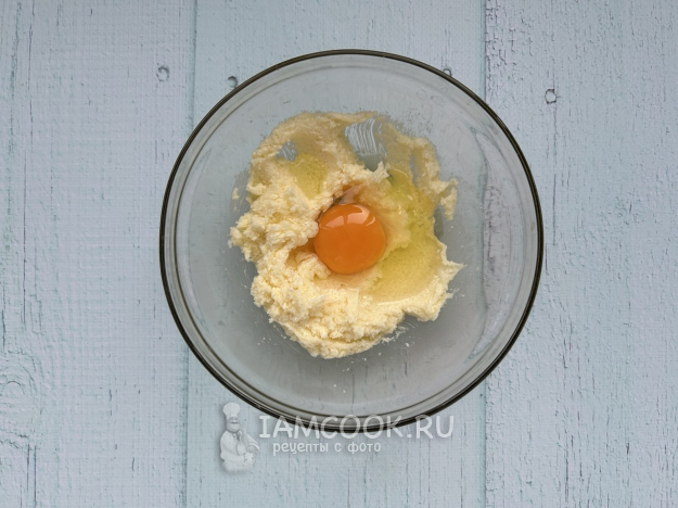 К яично-сахарной смеси добавьте яйцо комнатной температуры, перемешайте.