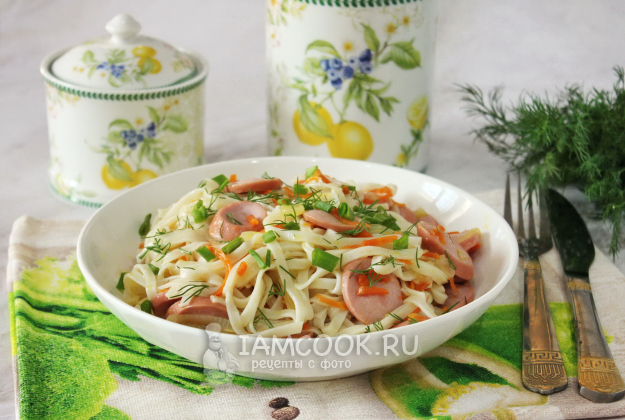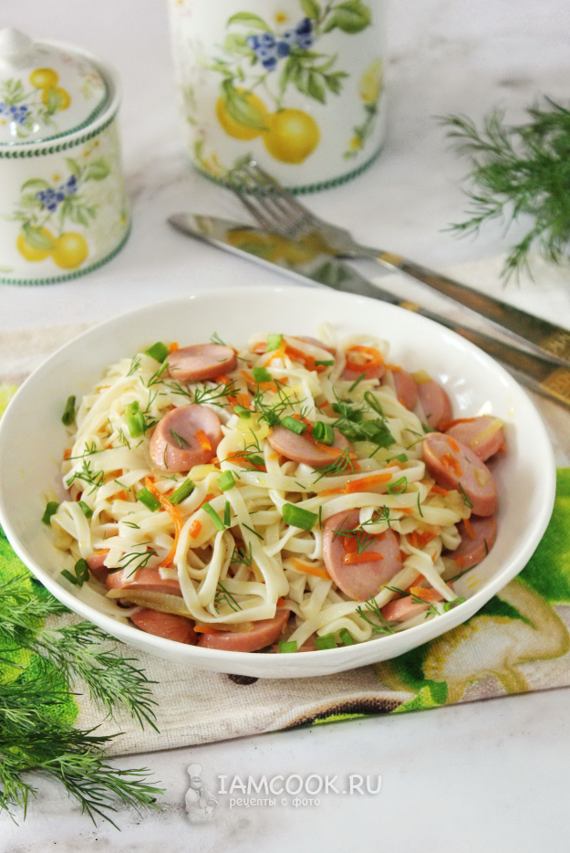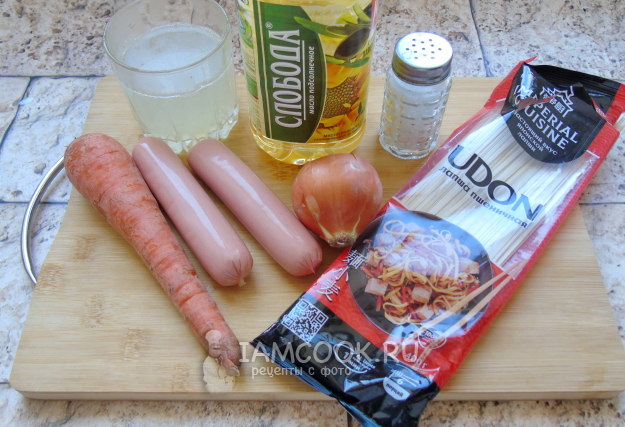 Соберите ингредиенты для приготовления лапши удон с сосисками.