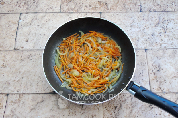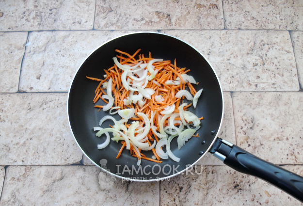 Репчатый лук и морковь очистите, помойте. Лук нарежьте перьями или полукольцами, а морковь - соломкой или натрите на терке для моркови по-корейски. Выложите в сковороду с растительным маслом.