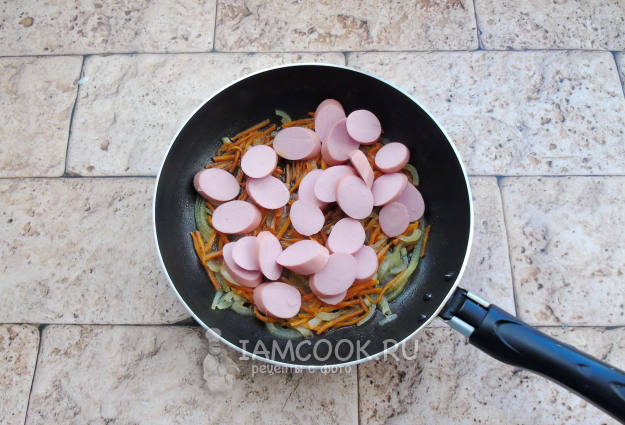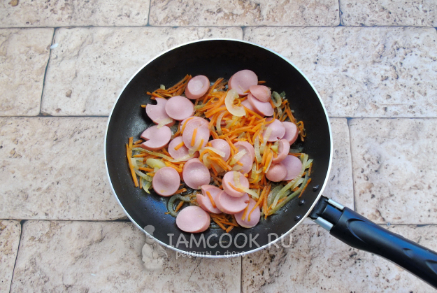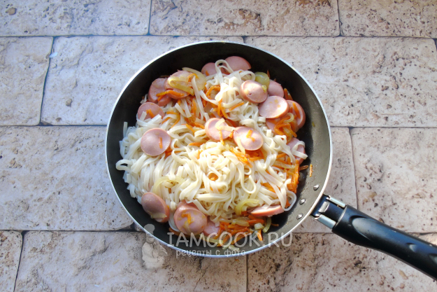 Добавьте удон в сковороду с морковью, луком и сосисками, перемешайте.