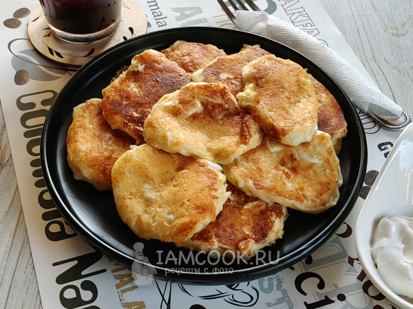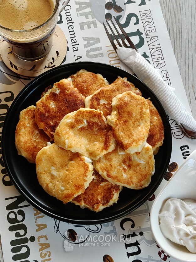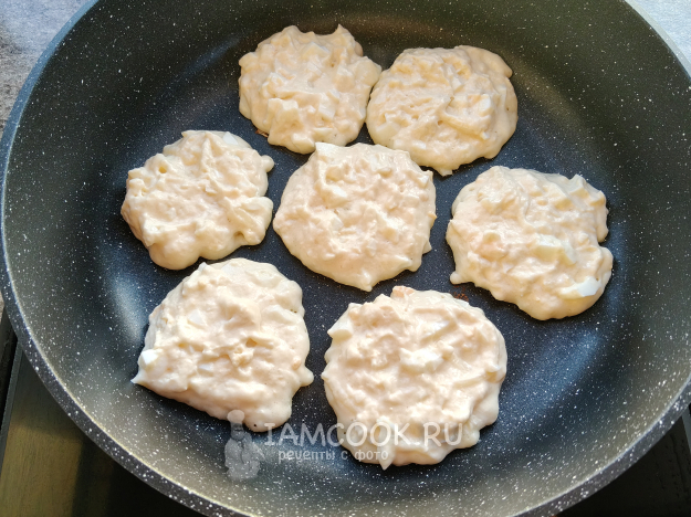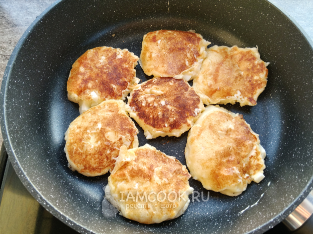 Когда оладьи подрумянятся, перевернуть, накрыть крышкой, печь на среднем огне.
