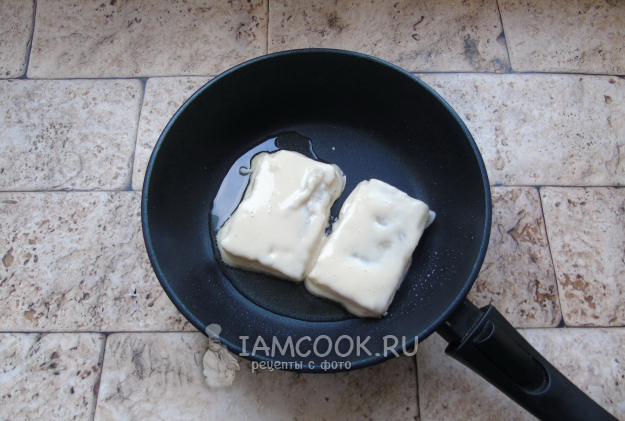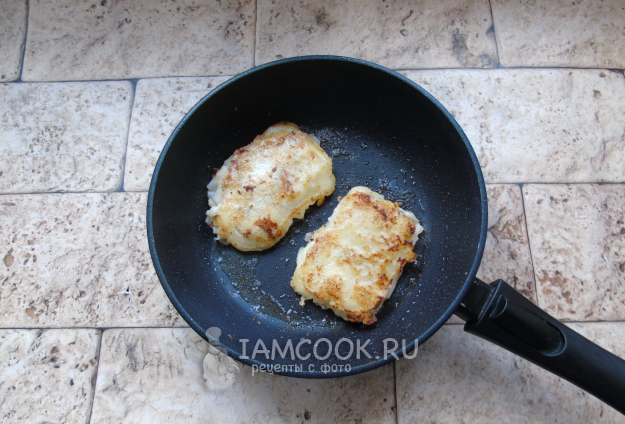 Обжарьте филе камбалы в брикетах на сковороде с обеих сторон до золотистой корочки.