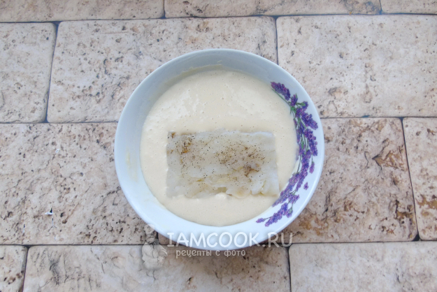 Брикеты камбалы разморозьте, посолите и поперчите. Окуните в кляр со всех сторон.