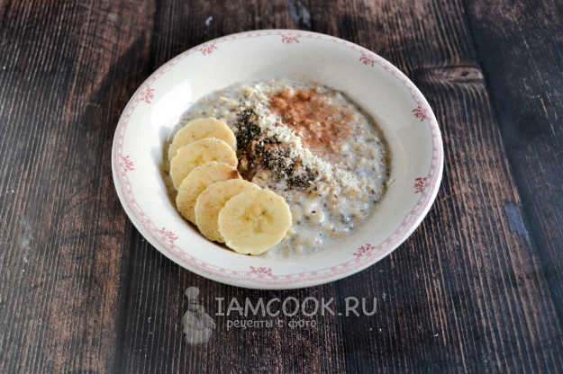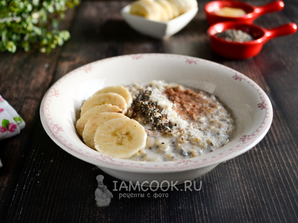 Подавайте кашу сразу же, горячей. Украсьте кружочками банана, посыпьте оставшейся кокосовой стружкой, корицей и щепоткой чиа.